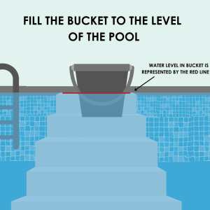 Step 3 After 1-2 days bucket check, if the water level in bucket is the same as pool water level you’re losing water to evaporation. If the water level in the bucket is under the level of the water, you have a leak.